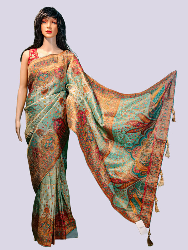 Whether you’re dressing up for Diwali, a family gathering, or a cultural event, this embroidered Sea Green saree will make you stand out with refined charm.