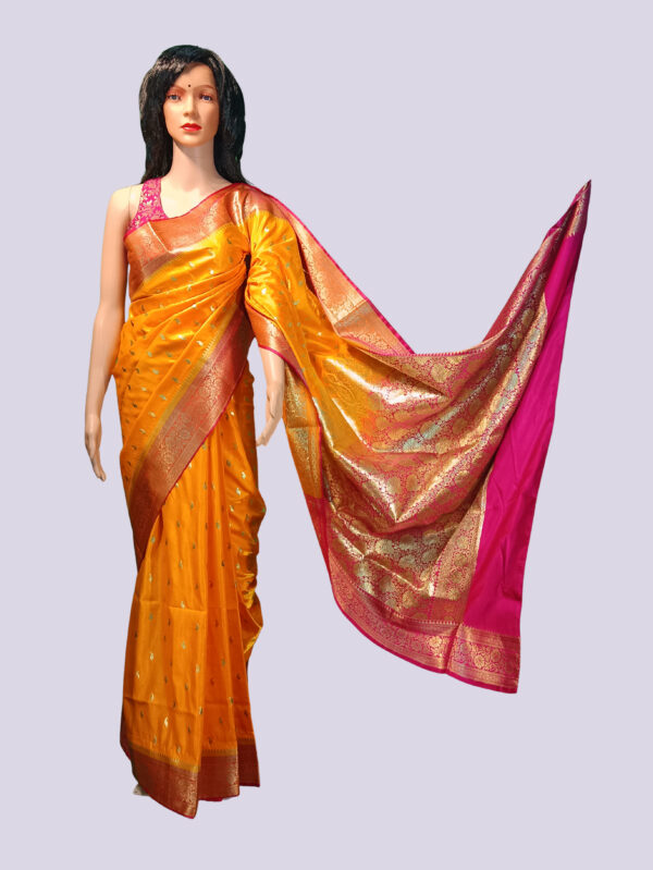 Turn heads at every event with this radiant Yellow and Golden Dualtone Polly Silk Saree, exquisitely designed with detailed embroidery work that adds richness and traditional charm. The shimmering dual-tone effect enhances the overall elegance of the saree, making it an ideal choice for weddings, receptions, parties, and festive celebrations.